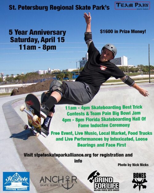 TODAY is St. Pete Skate Park’s 5 year anniversary skate contest and Florida Skateboard Hall of Fame event. April 15th at Cambell Park The cash pot just got sweeter. $1600 cash to give away for the St. Petersburg Regional Skatepark 5 year Anniversary Event presented by @hafkeplumbing 11am - 8pm. Join us…