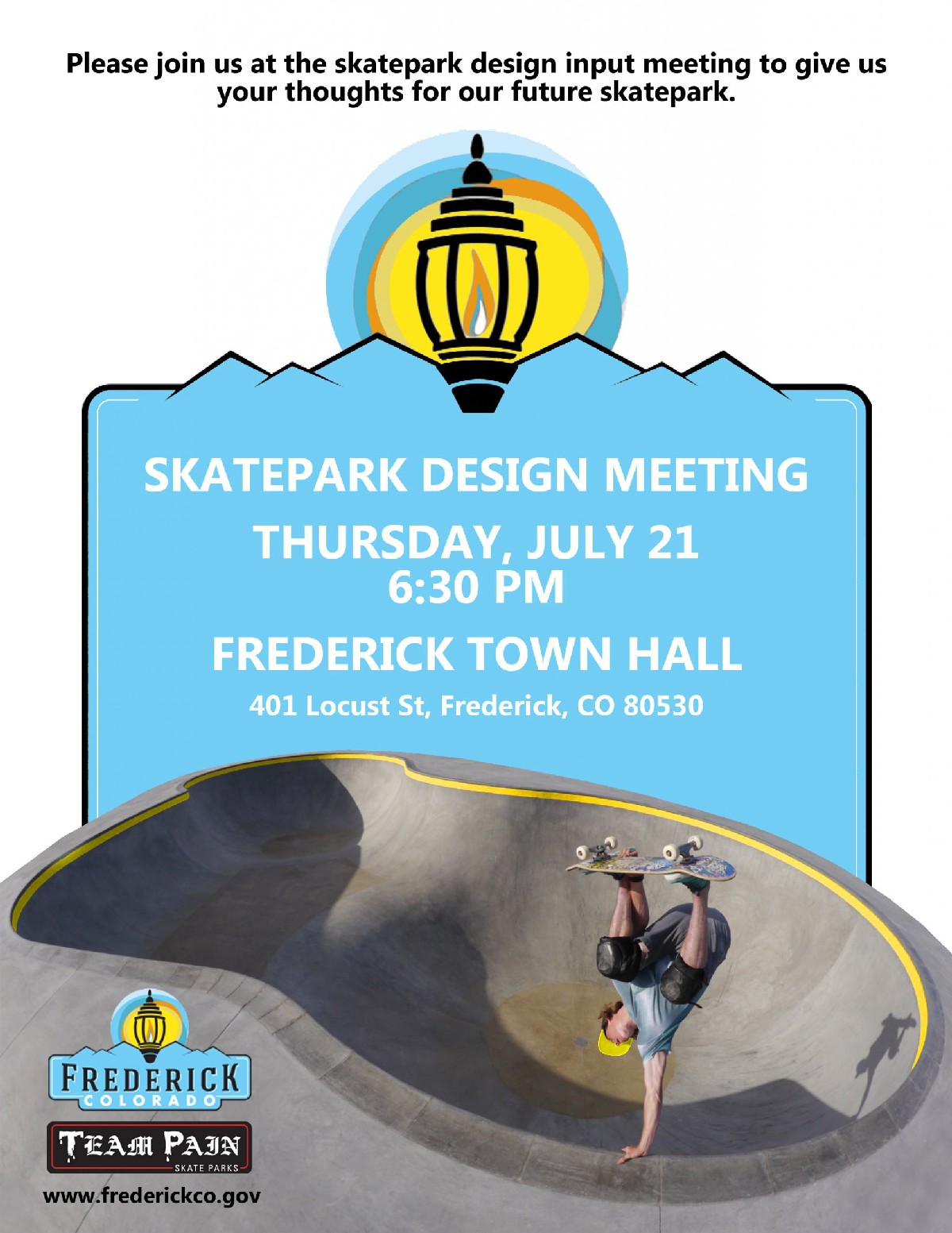 We are thrilled to have been awarded the design for the upcoming Frederick, CO Skate Park! If you live in Colorado and are interested in giving some feedback/ input please join us! The meeting will be at the Frederick Town Hall Thursday, July 21 at 6:30 PM. DO YOUR PART…